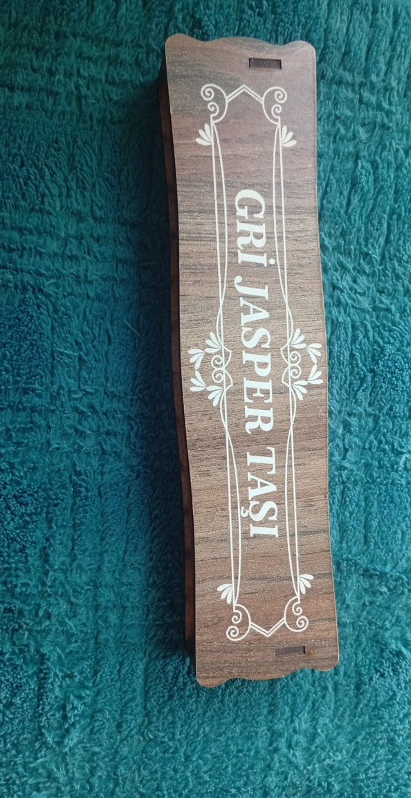 Üzerinde 'GRI JASPER TASI' yazılı, bej renkli desenli yoga kayışı.