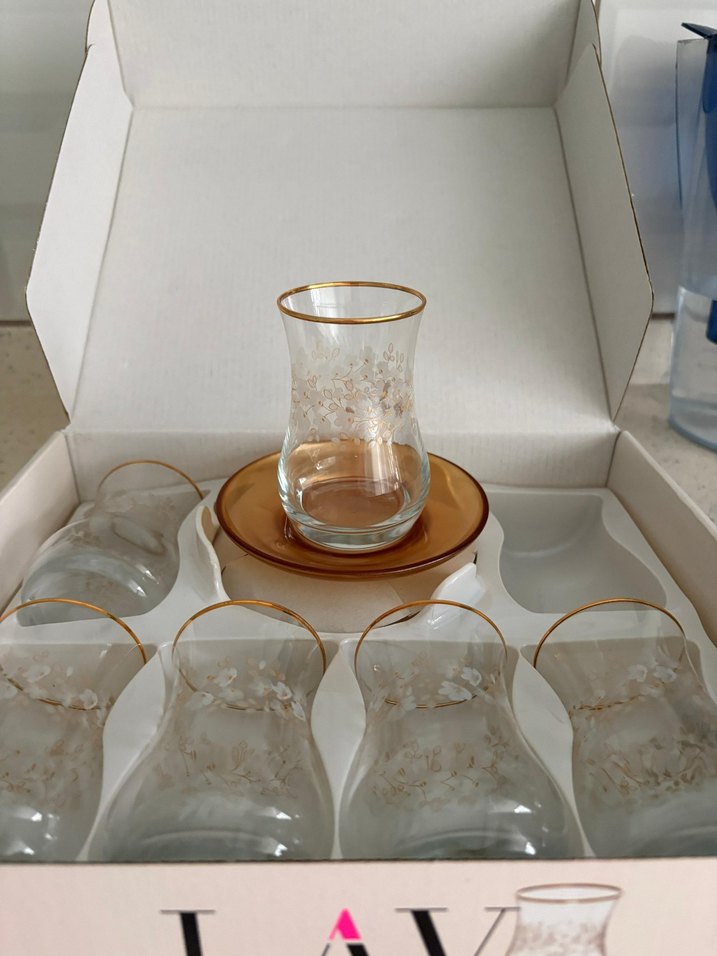 Altın detaylı ve bej çiçek desenli 6 adet çay bardağı ile uyumlu bej tabaklardan oluşan set. 12 parça