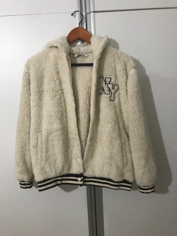 Uzun kollu, bej detaylı peluş kumaştan, rahat kesim ve normal boyda kadın ceket. Sokak stiline uygun, günlük kullanıma elverişli ve desensizdir.