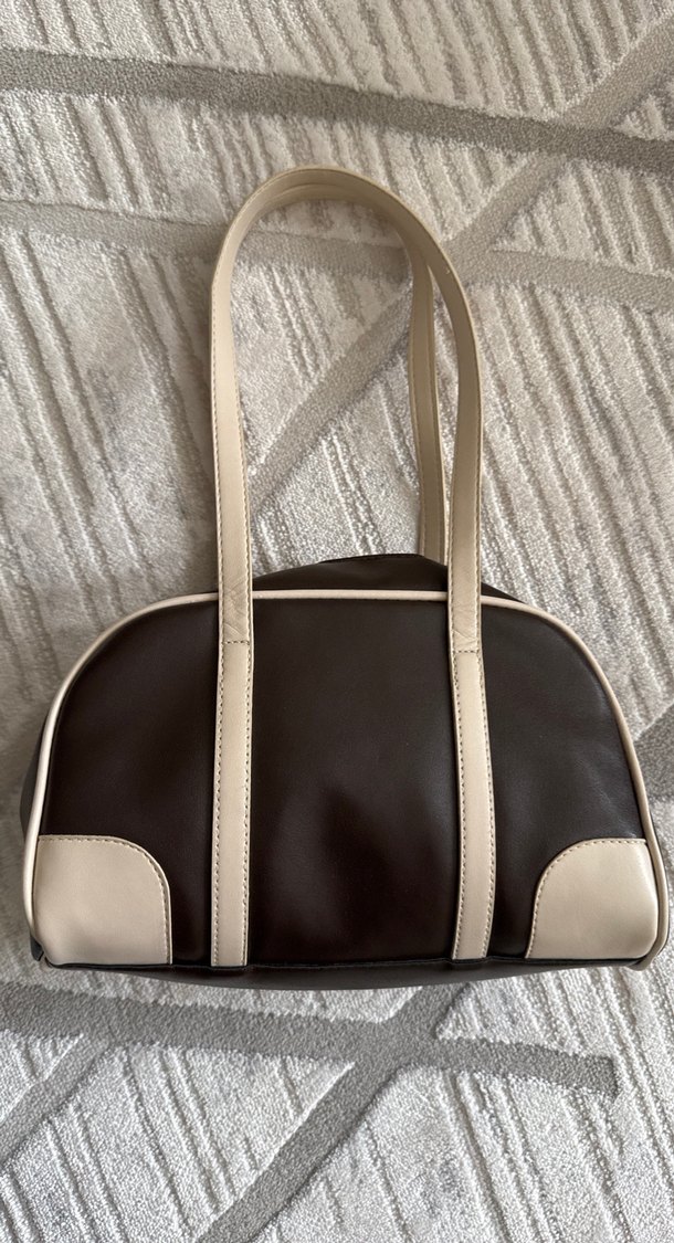 Sadece bir kaç kez kullandım. Bu kadın çantası koyu kahverengi deri gövdeye ve bej detaylara sahiptir. Fermuarlı kapama ve desen içermeyen yüzeyiyle klasik ve modern bir tarz sunar.