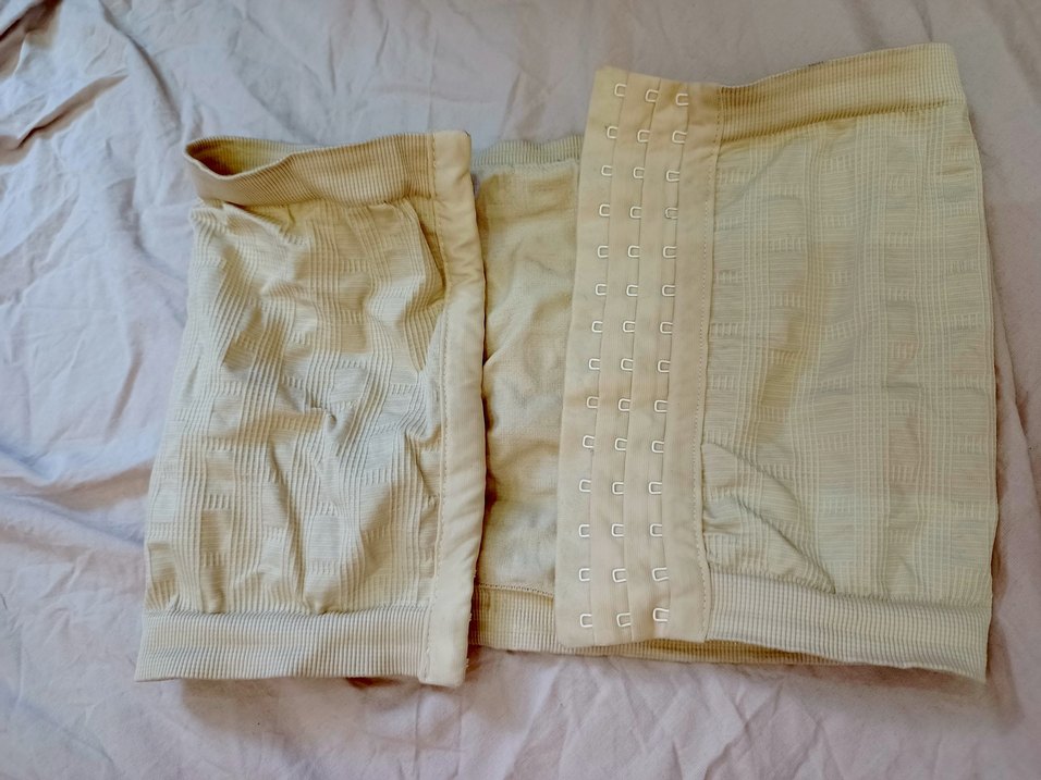 Bej, agraflı, vücuda oturan ve orta boy uzunlukta bel korsesi. Ayarlanabilir çoklu çıtçıt kapama detaylıdır.