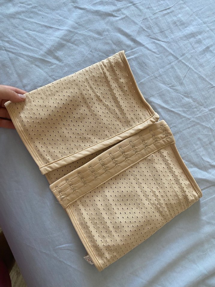 Bej renkte, dikişsiz ve nefes alabilen kumaştan yapılmış, vücuda oturan midi boy emzirme korsesi.