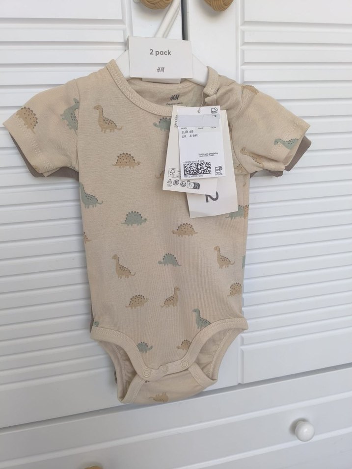 Bej renkli, kısa kollu bebek body, pastel dinozor desenli, yuvarlak yakalı, yumuşak sentetik kumaştan. 2'li paket halinde.