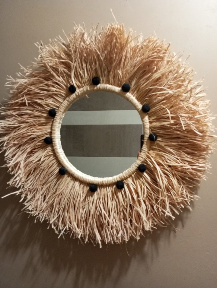 Hasır benzeri doğal malzemeden yapılmış, siyah boncuk detaylı yuvarlak bej çerçeveli dekoratif ayna. Rustik bir dokunuş katar.