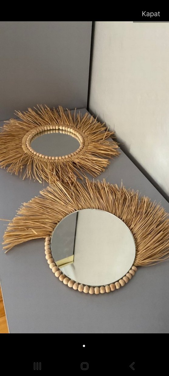 Ahşap boncuklar ve saman görünümünde parlak bej doğal çerçeveli yuvarlak aynalar. İç mekanlara rustik bir hava katıyor.