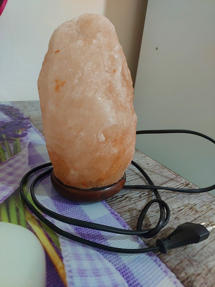 Bej renkte, doğal kaya tuzundan yapılmış lambadır. Ahşap taban üzerinde, elektrikli kablo ve fiş ile çalışır. ️