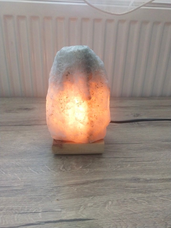 Bej doğal kaya tuzu lambası, ahşap taban üzerinde durur ve yumuşak, sıcak bir ışık yayar. ️