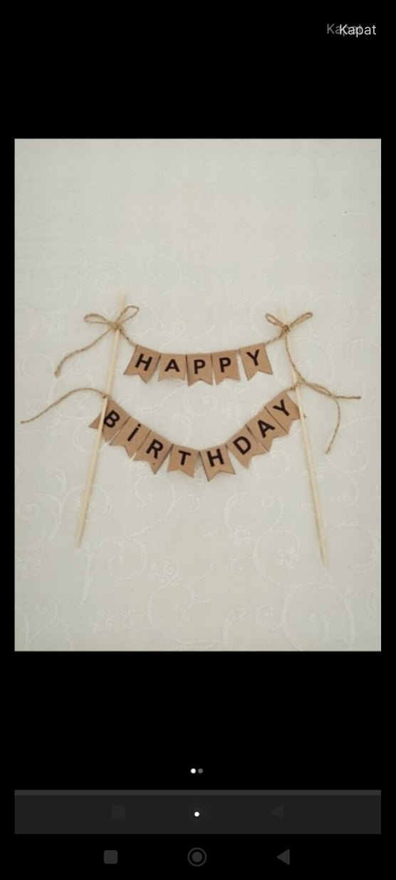 Bej renkte, "HAPPY" yazılı kumaş bayraklar ve iplerle süslenmiş doğum günü partisi dekoru.