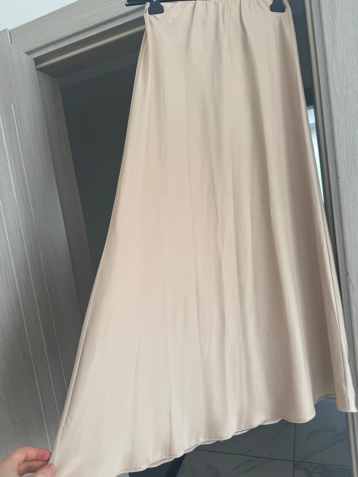 Bej renkte, dökümlü tasarıma sahip, ince ve uzun kadın eteği. Ofis için uygun, sade ve şık görünümlü.
