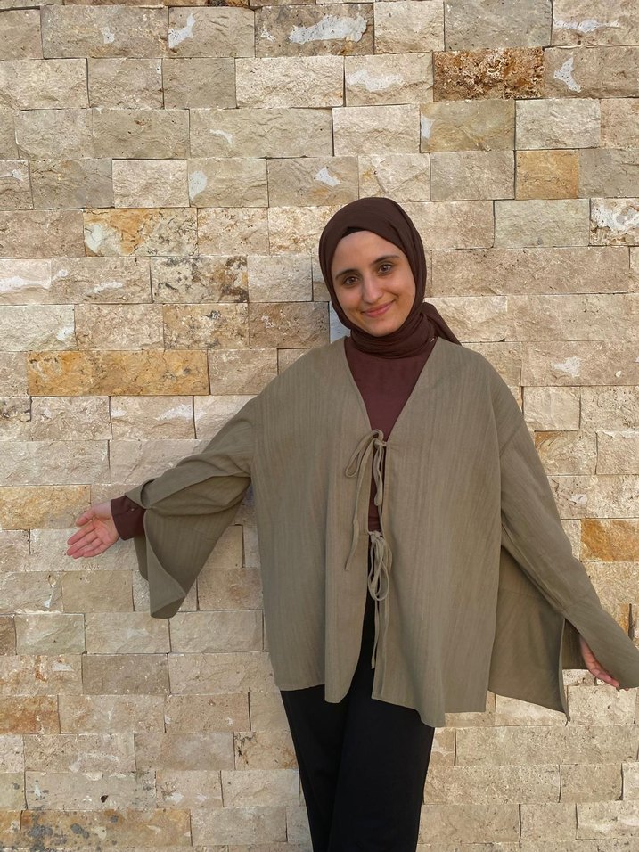 Yumuşak keten kumaştan yapılmış bej dökümlü kadın kimono ceket Salaş, bohem tarzıyla sade ve rahat bir görünüm sağlar. Sıfır birinci kalite ürün S.S.M.L beden