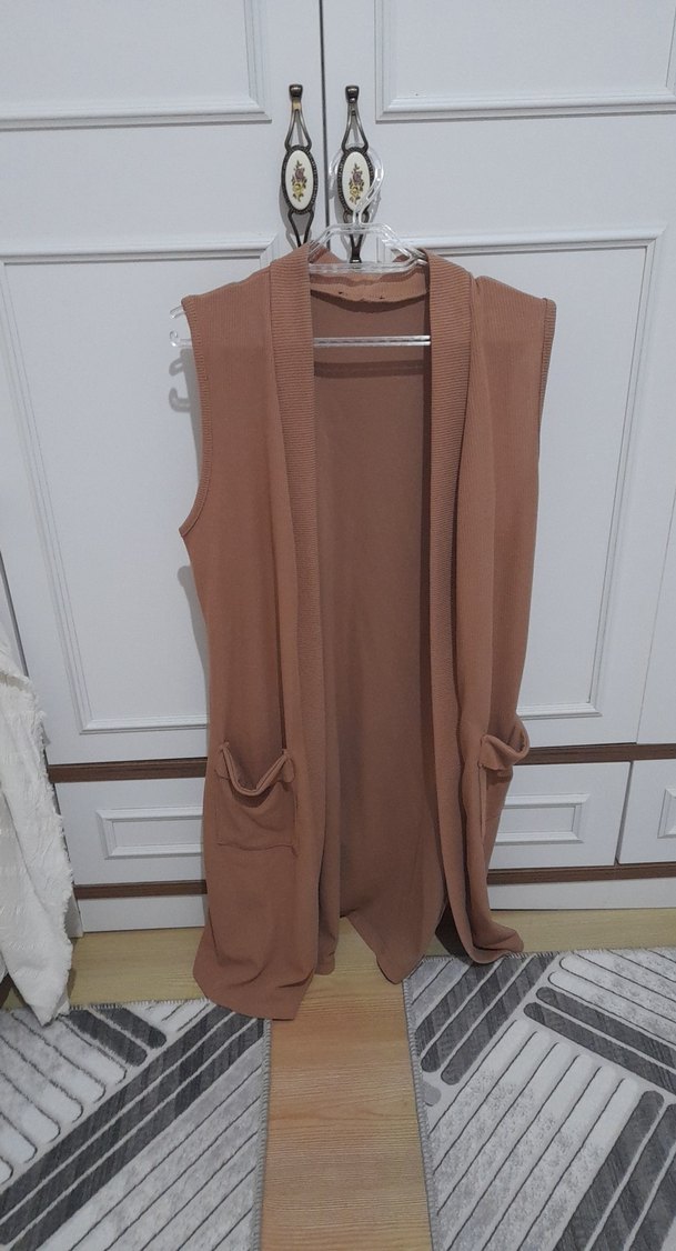 Yumuşak sentetik kumaştan yapılmış, dökümlü ve bol kesim bej kolsuz yelek. Askısız yakalı ve önünde iki cep bulunur. Günlük rahat stil için uygundur.