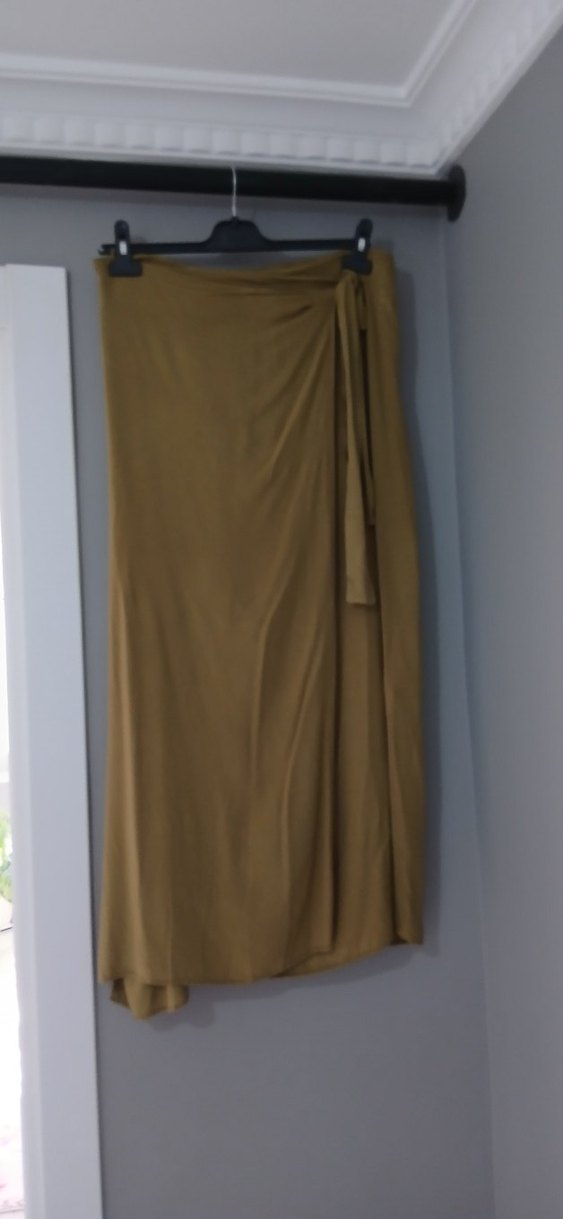 Bej renkte, dökümlü ve bol kesim uzun etek. İpeksi dokusu ve minimalist bohem tarzıyla günlük kullanıma uygundur.