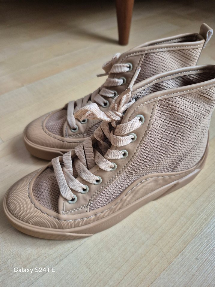 Bej renk, bağcıklı, dolgu topuklu kadın spor ayakkabı. Rahat taban ve nefes alabilen file yanlarla günlük sokak stiline uygun.