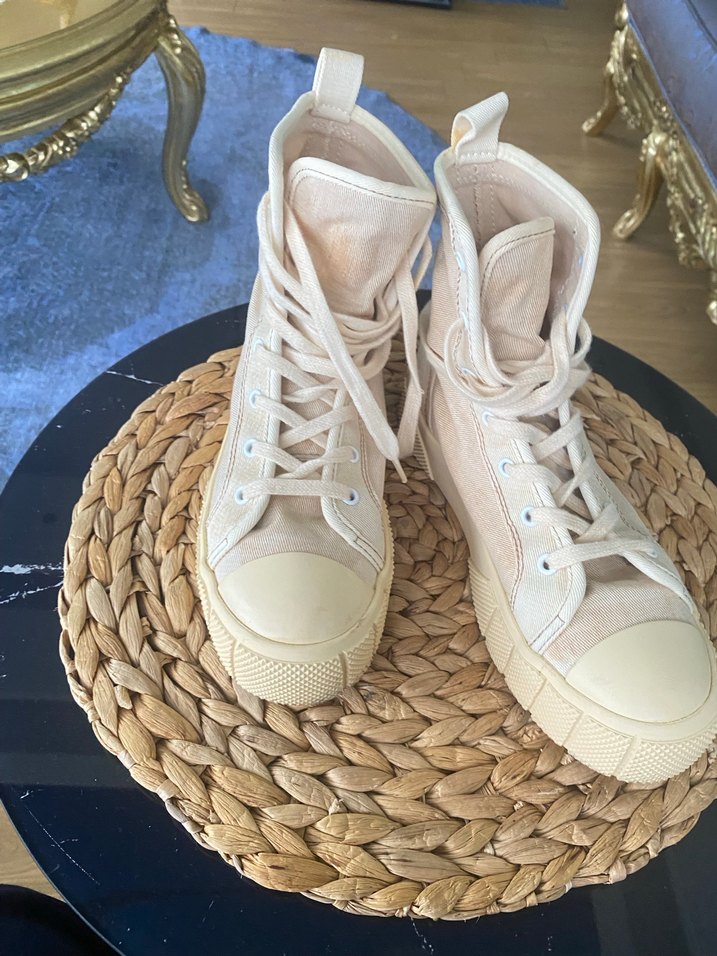 Bej renkte, dolgu topuklu ve bağcıklı kadın spor ayakkabısı. Kauçuk malzemeden üretilmiş, desensiz ve sokak tarzına uygun.