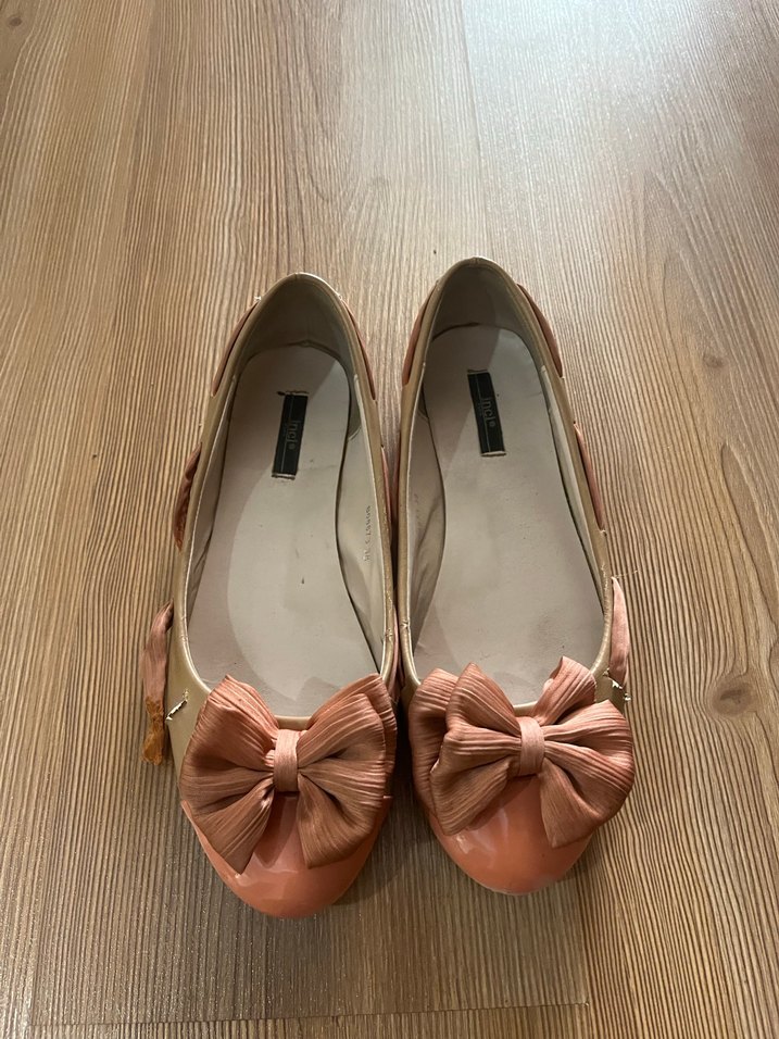Bej renkte, dolgu topuklu ve büyük fiyonk detaylı kadın babetleri, rahat kauçuk materyalden yapılmıştır. Ürün görsellerde görüldüğü gibidir.