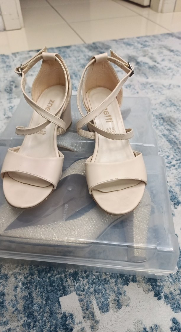 Bej renkli, bağcıklı bantlı, lastik malzemeden yapılmış dolgu topuklu kadın abiye ayakkabıdır. Minimalist ve çağdaş tarzdadır, düğün için uygundur.