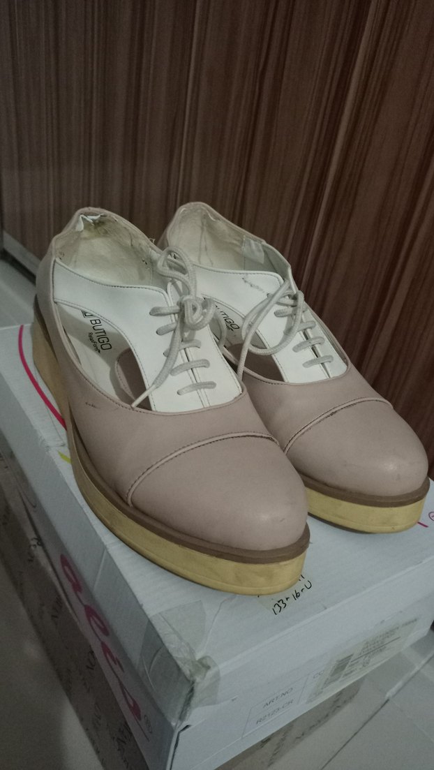 Bağcıklı tasarıma ve kauçuk tabana sahip bej dolgu topuklu kadın klasik ayakkabı, günlük kullanıma uygun rahat ve şık bir seçenektir. 38