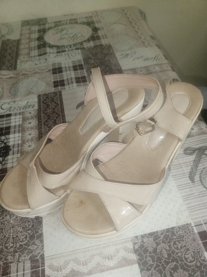 Bej renkli, tokalı bantlı, kauçuk malzemeden yapılmış dolgu topuklu kadın sandaletleri. Minimalist ve klasik tarzda, günlük kullanıma uygun. ürünün defosu vardır fiyatı o yüzden düşük tuttum