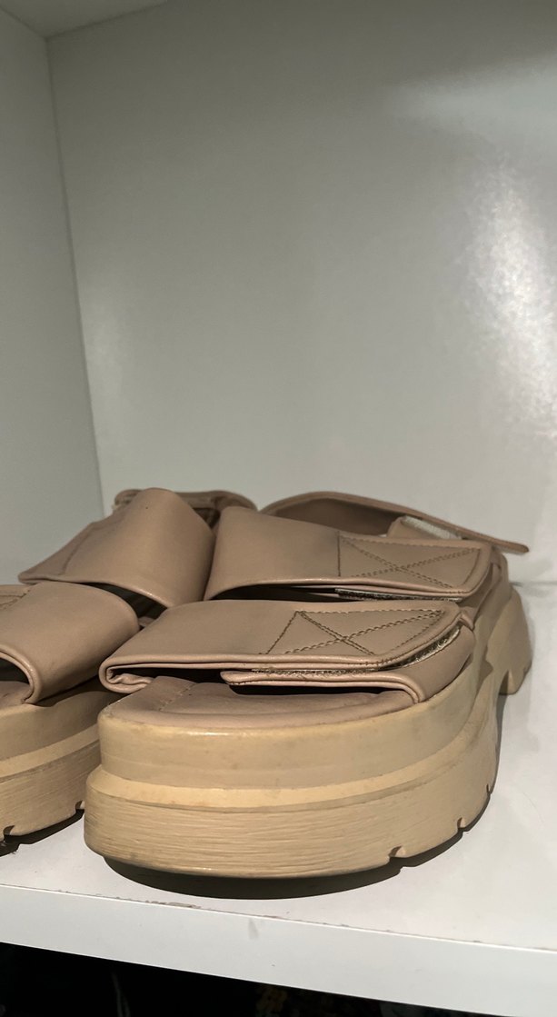 Bej renkte, tokalı bantlı, dolgu topuklu kadın sandalet. Kauçuk malzemeden üretilmiştir, minimal ve desensiz tasarıma sahiptir.