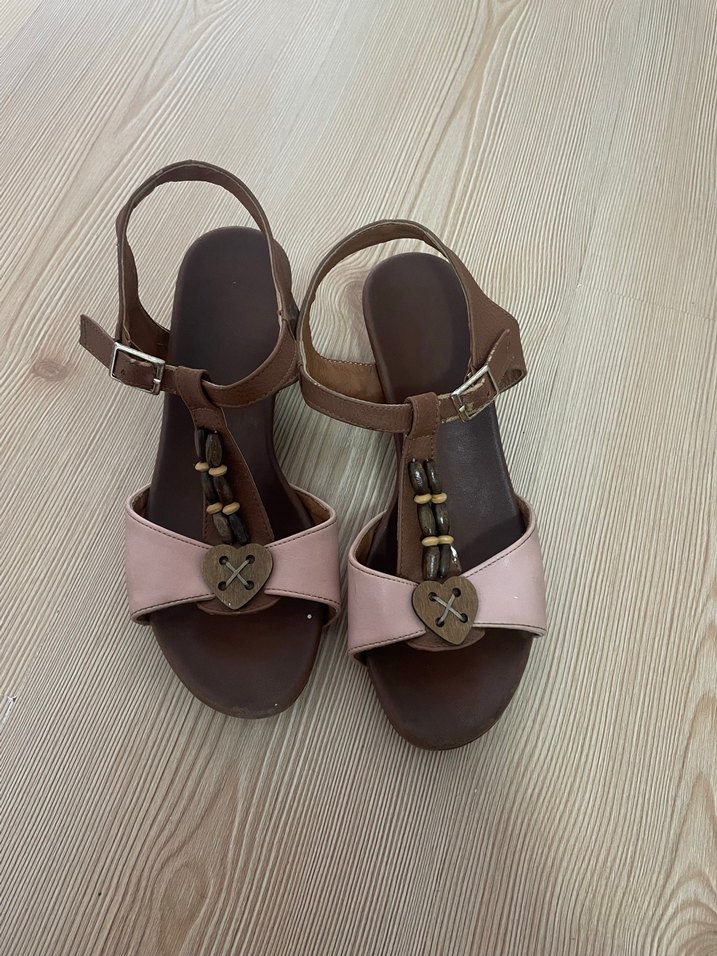 Bej renkte, tokalı kayışlara ve pastel yılan derisi desenine sahip dolgu topuklu sandalet. Kauçuk malzemeden, minimalist ve trend günlük kullanım için uygundur. Vintage, az giyildi. Marka temsili ve etiketi yok