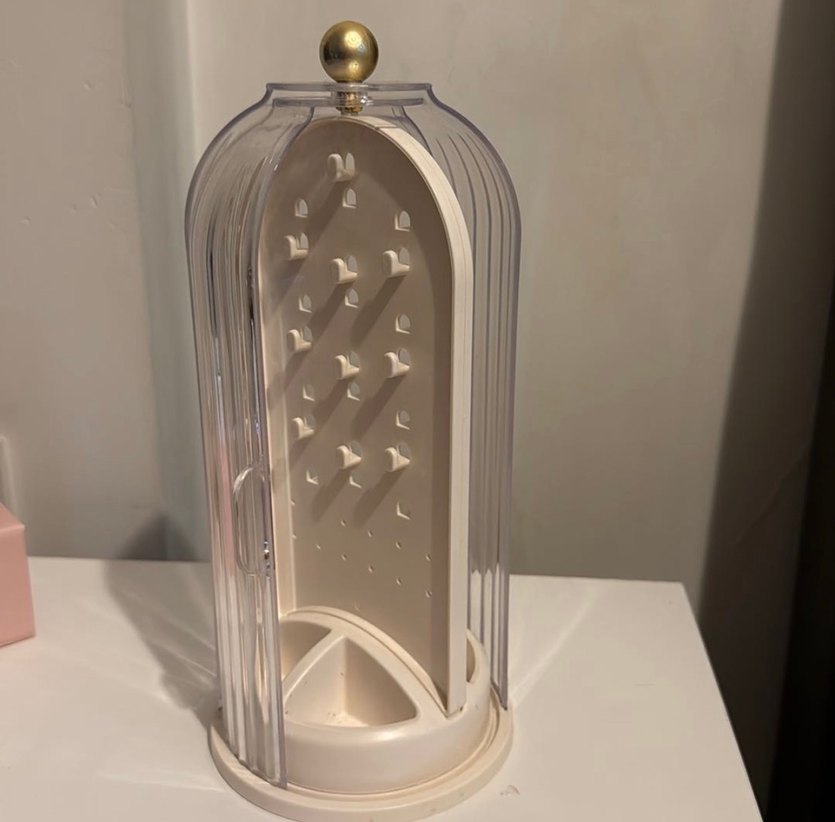 Bej renkli, dönerli makyaj organizeri, çoklu askıları ve şeffaf dış kapağı ile aksesuarlarınızı düzenler. Üstte altın renkli top tutma yeri bulunur.