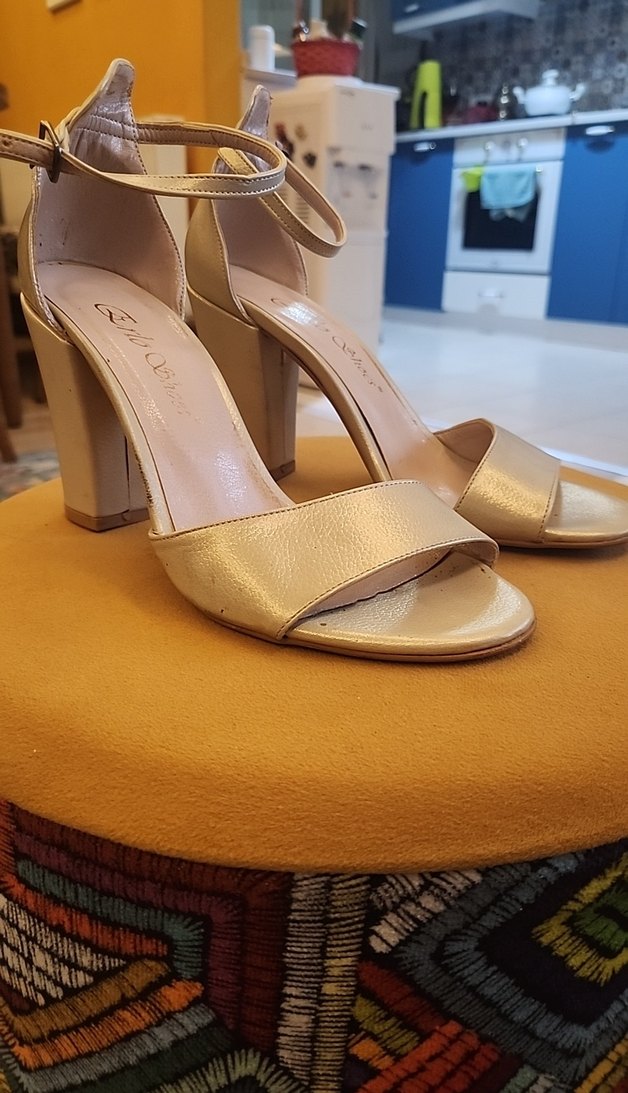 Bej parlak malzemeden yapılmış, tokalı bilek kayışlı, parlak yılan deseni detaylı kadın topuklu ayakkabılar. Modern klasik stilde, düğünler için uygun.