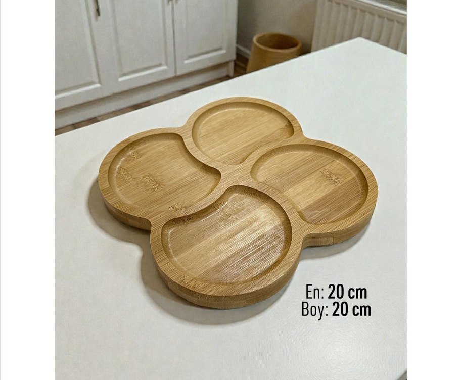 Bej renkte, 20x20 cm ölçülerinde, dört bölmeli ahşap tabak. Atıştırmalıklar için uygun, counterculture tarzında.