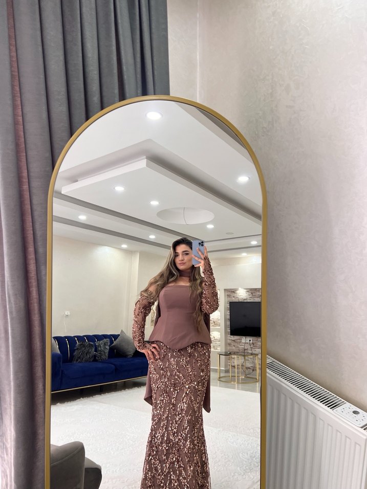 Bej Drape Detaylı Uzun Kollu Abiye Elbise