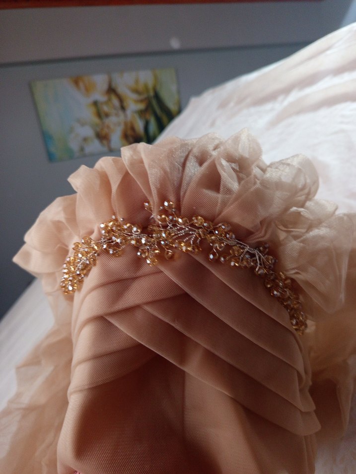 sentetik kumaştan drapeli ve boncuk detaylı bohem tarzda kadın saç aksesuarı. söz ve nişan için uygundur. acık sütlü kahve renginde bir kez takılmıştır. bır hatası yoktur.