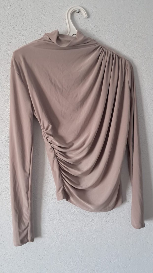 Bej, yüksek yakalı ve uzun kollu kadın bluz, drapeli detaylarla minimal ve çağdaş bir görünüm sunar. Yumuşak keten kumaştan üretilmiştir, günlük kullanıma uygundur.