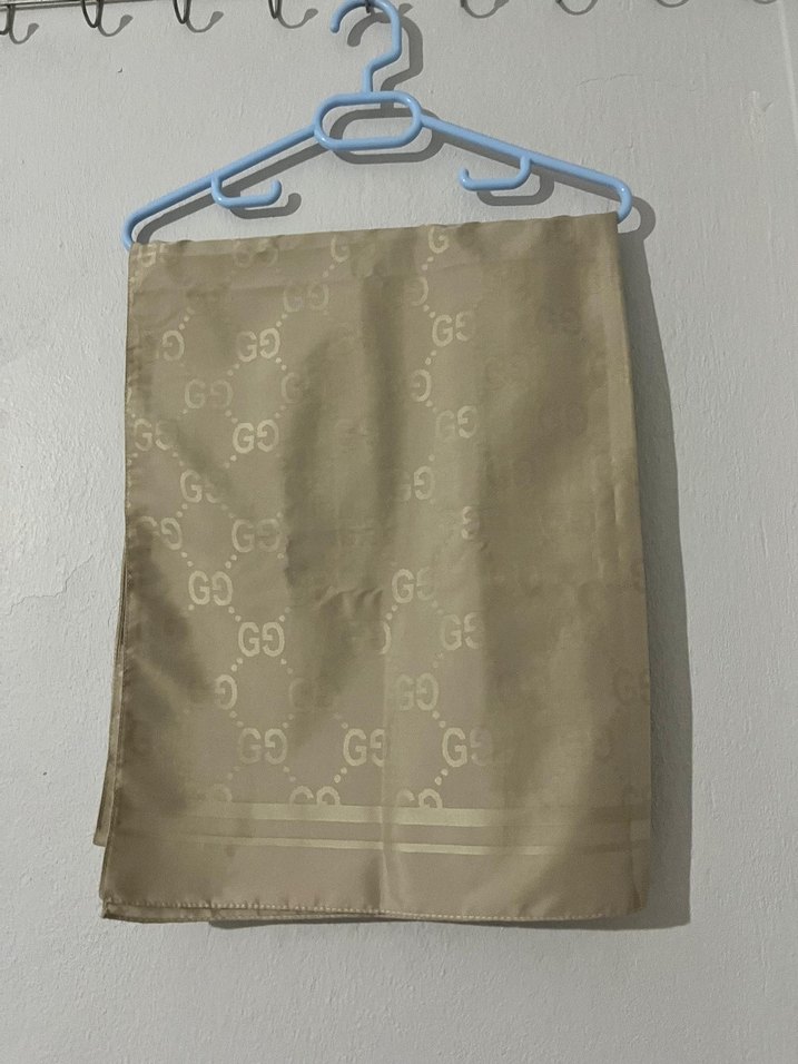 Sentetik kumaştan, bej renkte, drapeli tasarıma sahip kadın şalı. Minimalist tarzda, sokak modasına uygun.