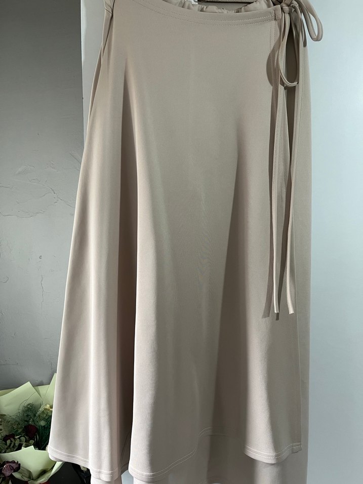 Bej renkte, drapeli tasarıma sahip, bol kesim kadın uzun eteği. Yumuşak sentetik kumaştan yapılmıştır ve minimalist normcore tarzındadır.