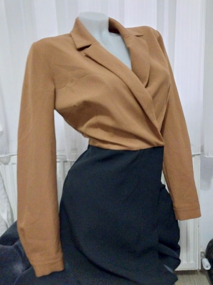 uzun kollu ve yakalı kısa kesim kadınTulum Drapeli ön detayı ile şık ve modern bir görünüm sunar. Sentetik kumaştan üretilmiştir. Trendyol dan alındı 36 beden