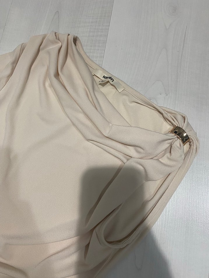 Drapeli ve kayık yaka, kolsuz kesime sahip, pastel bej renkte, sentetik kumaştan yapılmış, vücuda oturan çağdaş tarzda bluz.