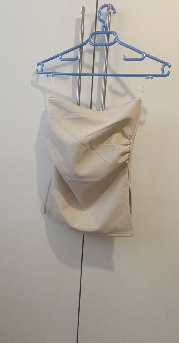 Bej renkli, keten kumaştan yapılmış, drapeli ve kolsuz straplez kadın bluz. İnce kesimi ve midi boyu ile minimalist sokak stiline uygundur.