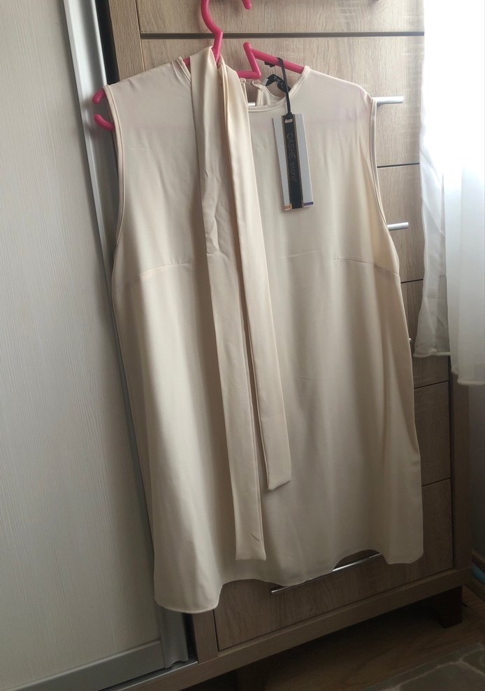 Kolsuz, bej renkte, ipeksi dokulu, drapeli halter yaka midi bluz. Ofis için klasik şıklık sunar.