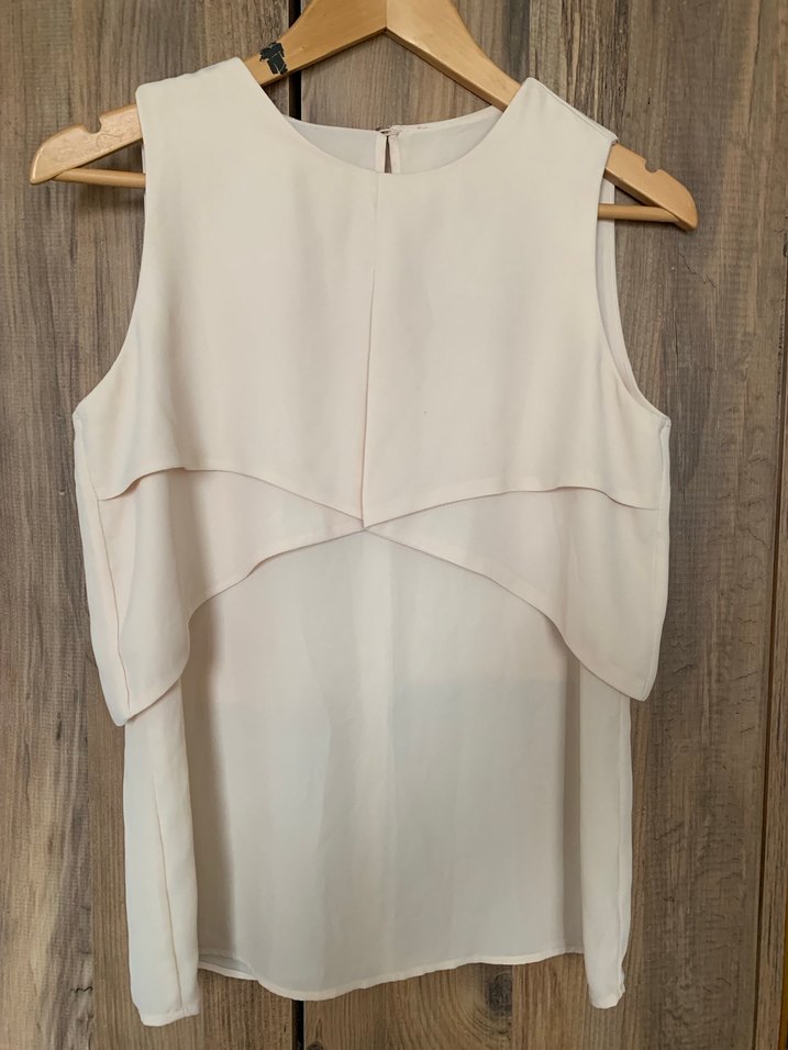 Kolsuz, pudra renkte, drapeli ve bol kesim midi bluz. Yumuşak keten kumaştan yapılmıştır, askısız yakaya sahiptir. Ofis için uygundur.
