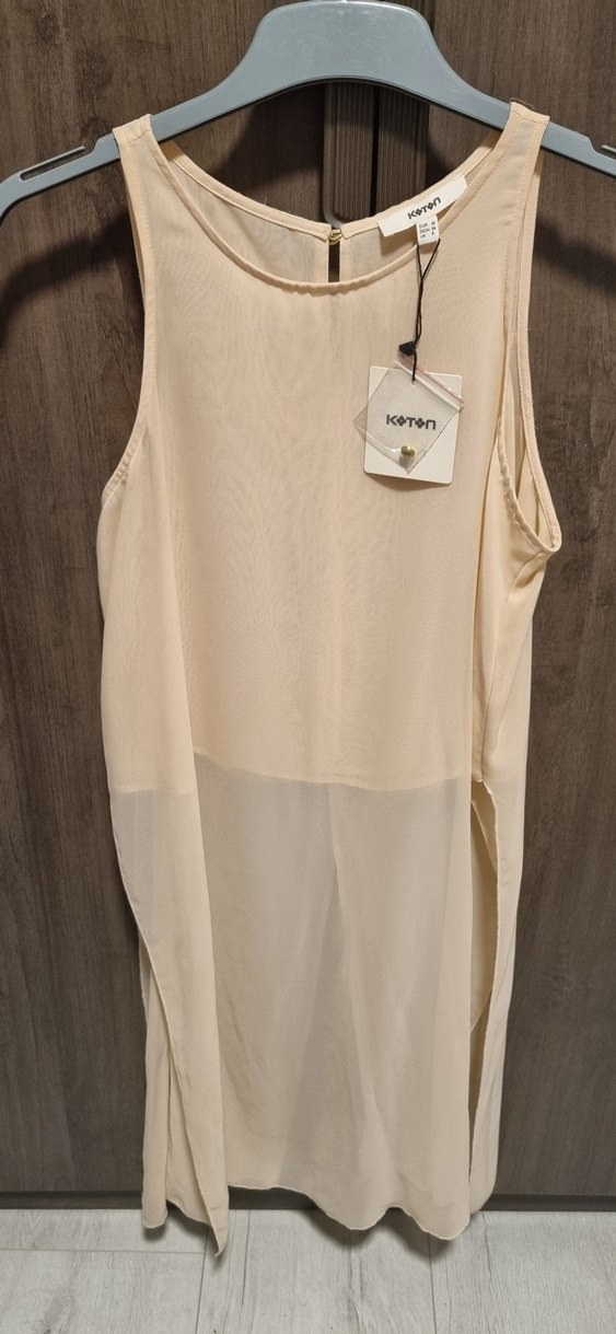Bej renkte, kolsuz, drapeli ve salaş kesim midi uzunluğunda bluz. İpek gibi yumuşak kumaştan, yuvarlak yaka detaylı, ofis için uygun şık tasarım.