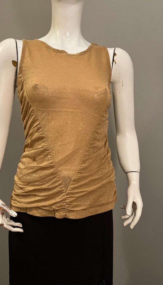 Kolsuz, V yakalı, bej renkli hamile bluzu. Parlak keten kumaştan, drapeli ve modern kesimli. Midi boy ve desensiz, günlük kullanıma uygun.