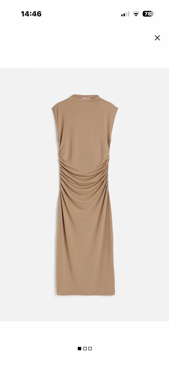 Bej renkte, yüksek yakalı ve kolsuz uzun elbise. Keten kumaştan, drapeli detayları ve dar kesimiyle minimalist, çağdaş bir görünüme sahiptir. Günlük kullanım için uygundur.