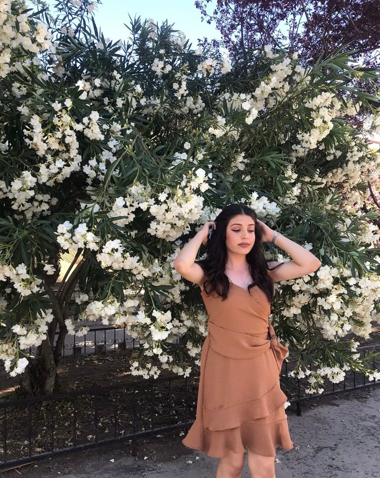 Bej renkte, drapeli tasarıma sahip midi boy, straplez yaka ve çiçek desenli, bol kesim bohem tarz elbise. Düğünler için uygundur.