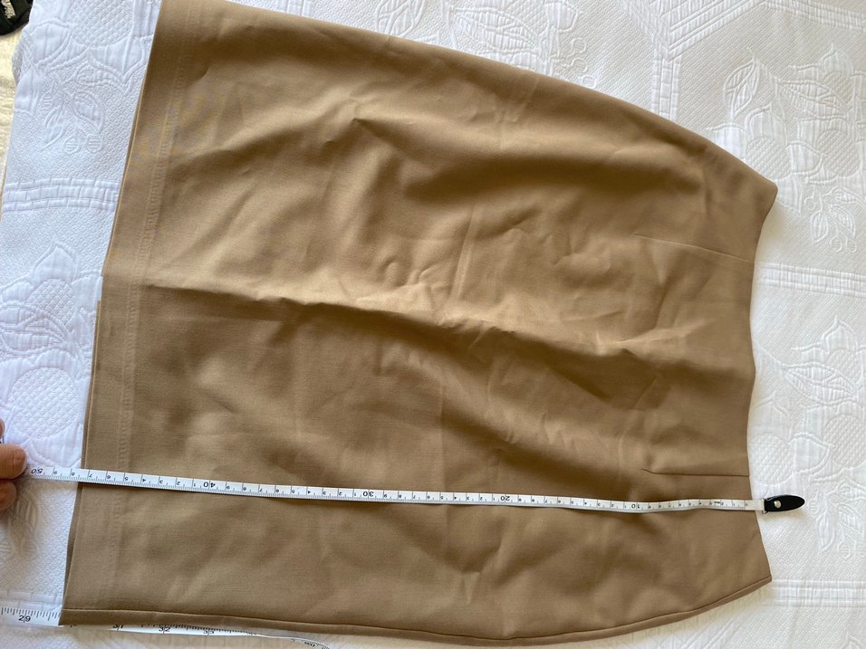 Parlak bej sentetik kumaştan, drapeli ve midi boy, dar kesim hamile eteği, minimalist normcore tarzda günlük kullanıma uygundur.
