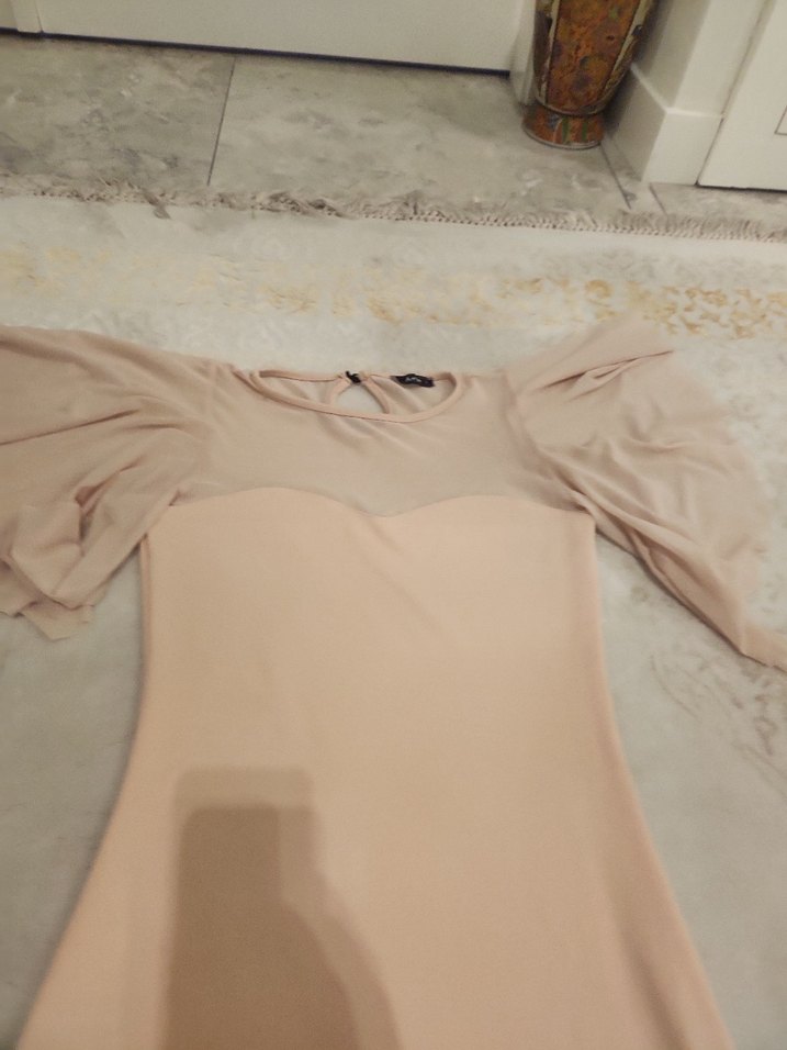 Bej renkte, drapeli kısa kollu, tek renk, minimal tasarımlı, midi uzunlukta, vücuda oturan kadın elbisesi.