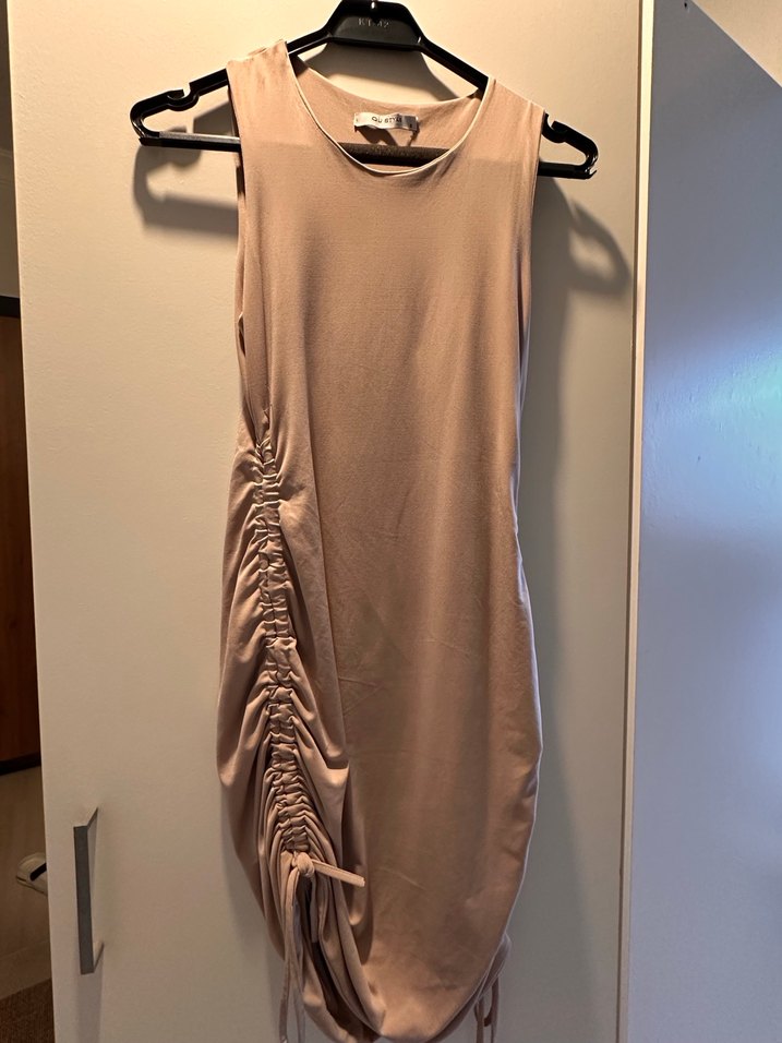 Bej renkte, kolsuz, midi uzunlukta ve vücuda oturan bir kadın elbisesi. Bir yanında drapeli detaylar ve yuvarlak yaka bulunur, romantik akşamlar için uygundur.