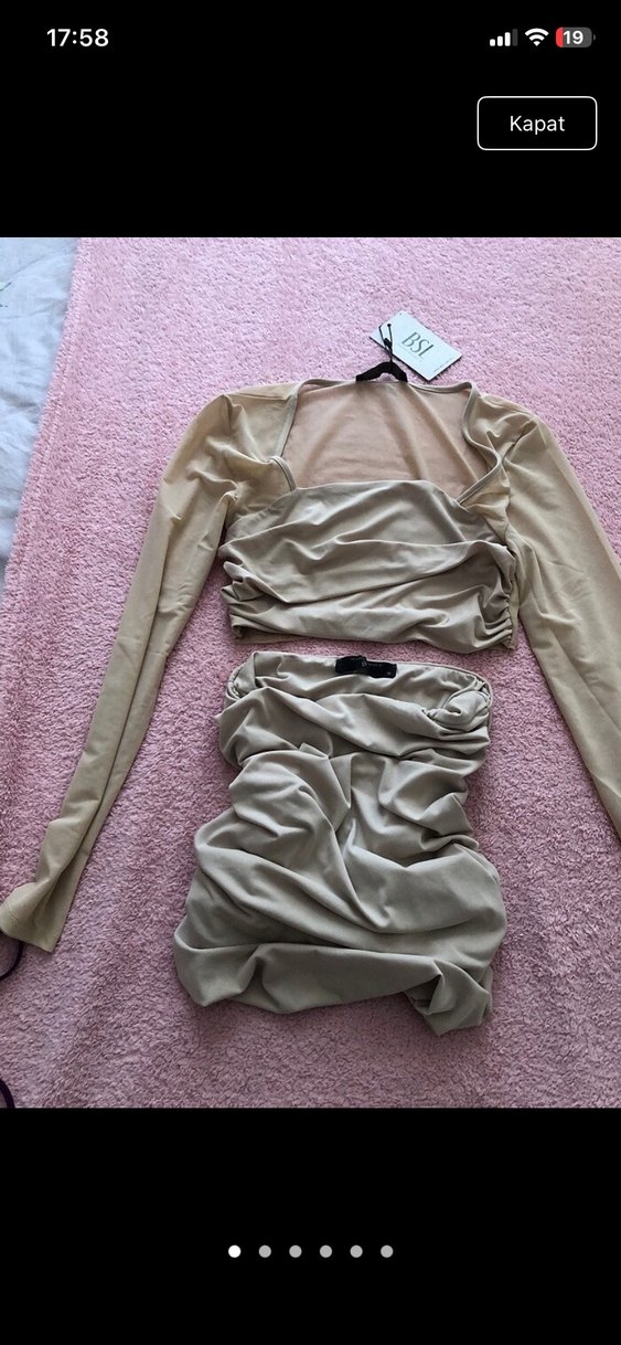 Bej renkte, drapeli detaylara sahip, straplez mini etek ve uzun kollu üstten oluşan dar kesim kadın abiye elbise. Romantik akşamlar için uygun.