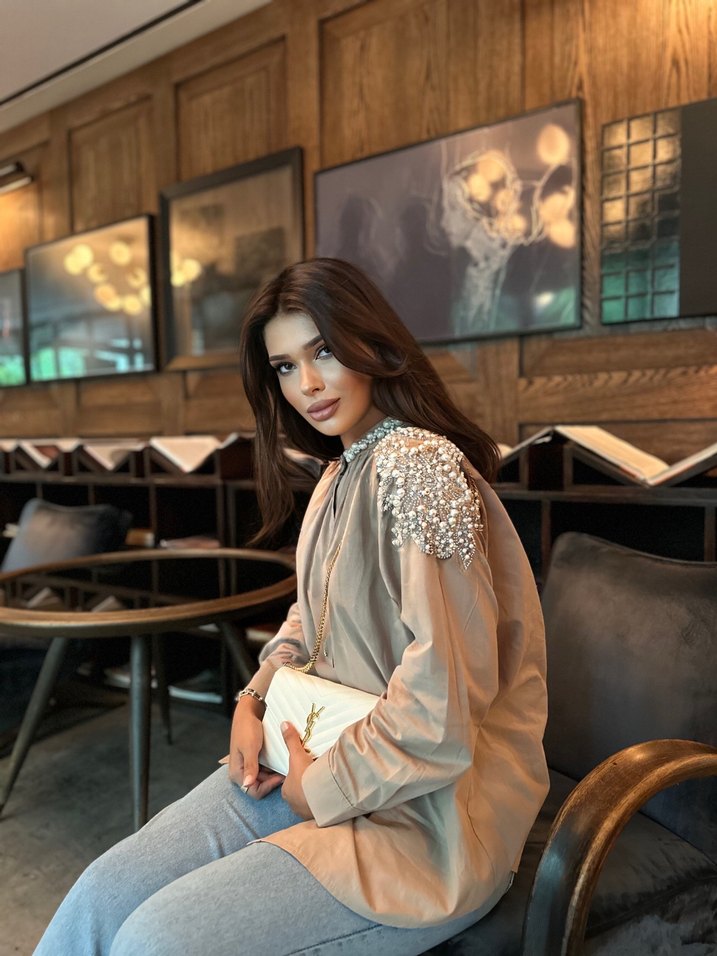 Bej renkte, uzun kollu ve straplez yakalı, bol kesim mini kadın ceket. Drapeli tasarım ve baskılı detaylar, sentetik kumaştan günlük sokak stili için uygun.