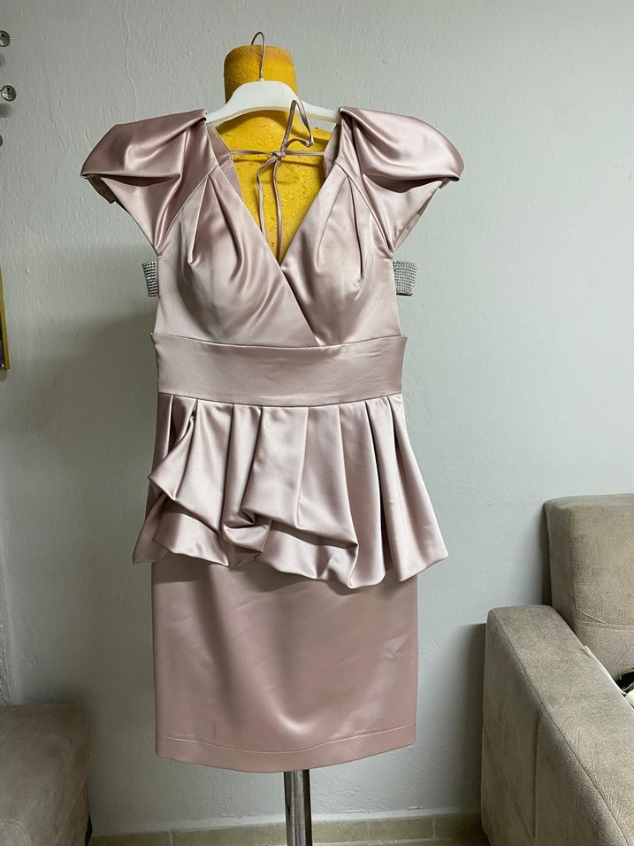 Bej renkli, V yakalı, drapeli detaylı ve askılı kollu mini abiye elbise. Düğünler için uygun modern klasik tarzda.