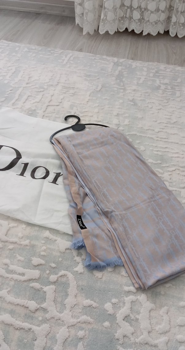 Bej renkte, drapeli tasarıma sahip yumuşak sentetik kumaştan şal. Rahat ve modaya uygun streetwear tarzında, Dior marka toz torbasıyla birlikte.
