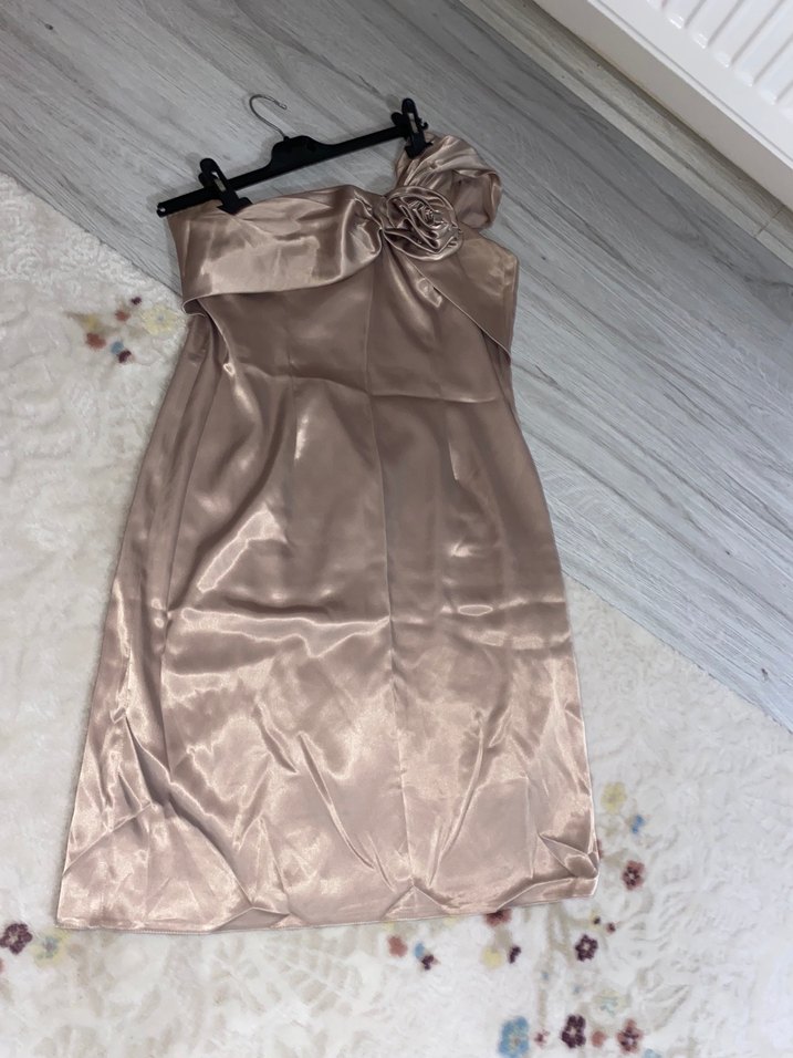 Bej renkli, straplez tek omuz abiye elbise, drapeli tasarımı ve vücuda oturan kesimi ile şık ve parlak bir görünüme sahiptir.