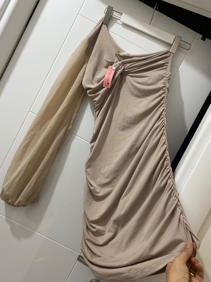 Bej renkli, drapeli tasarıma sahip straplez abiye elbise. İnce askılı ve vücuda oturan kesimiyle midi boyda, romantik akşamlar için uygun. Hafif renk ve desensiz kumaş şık bir görünüm sunar.✨